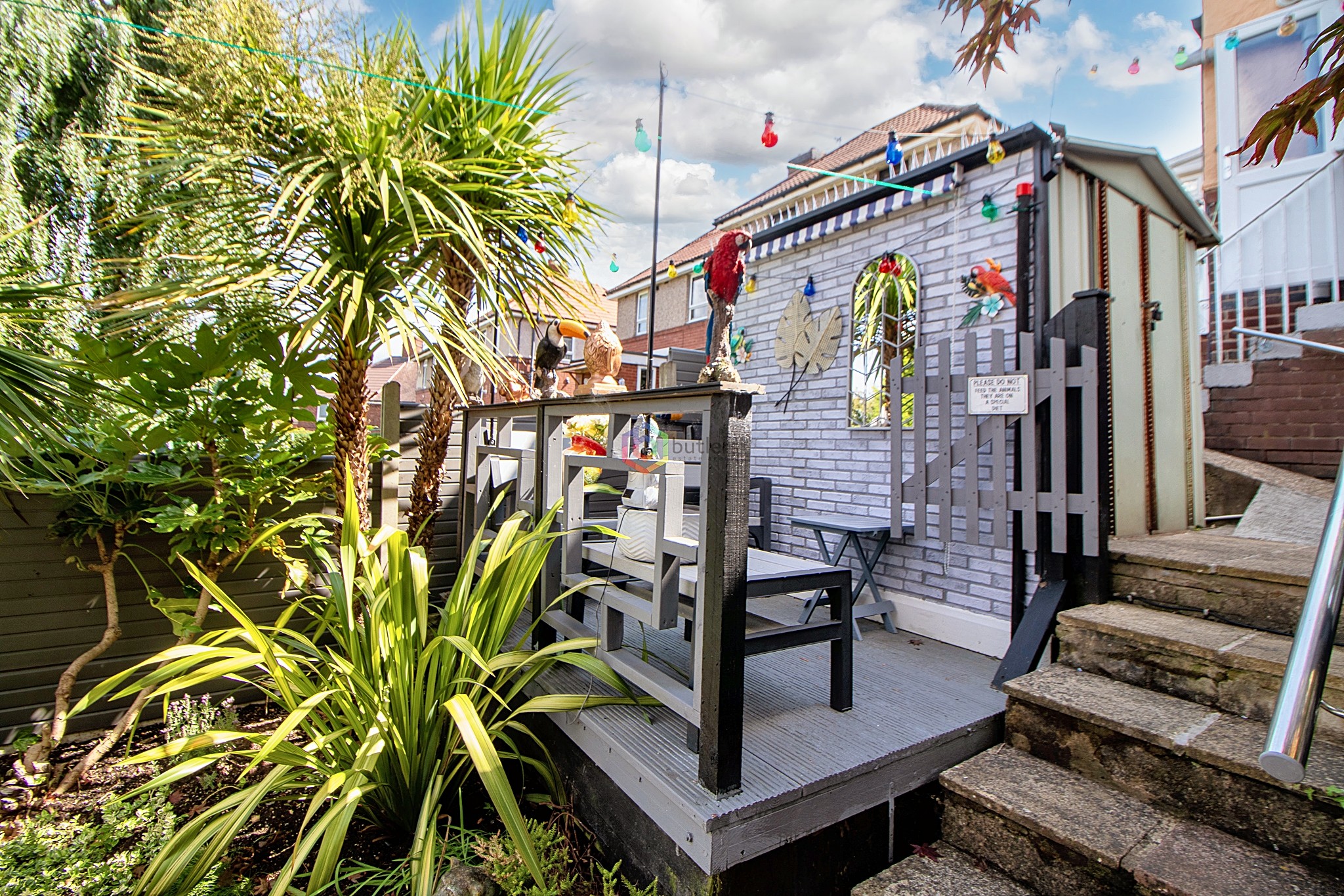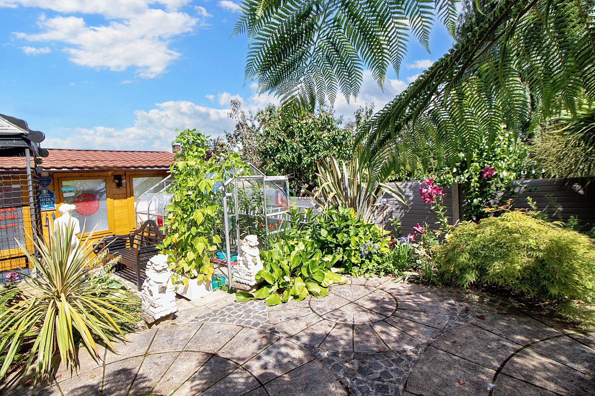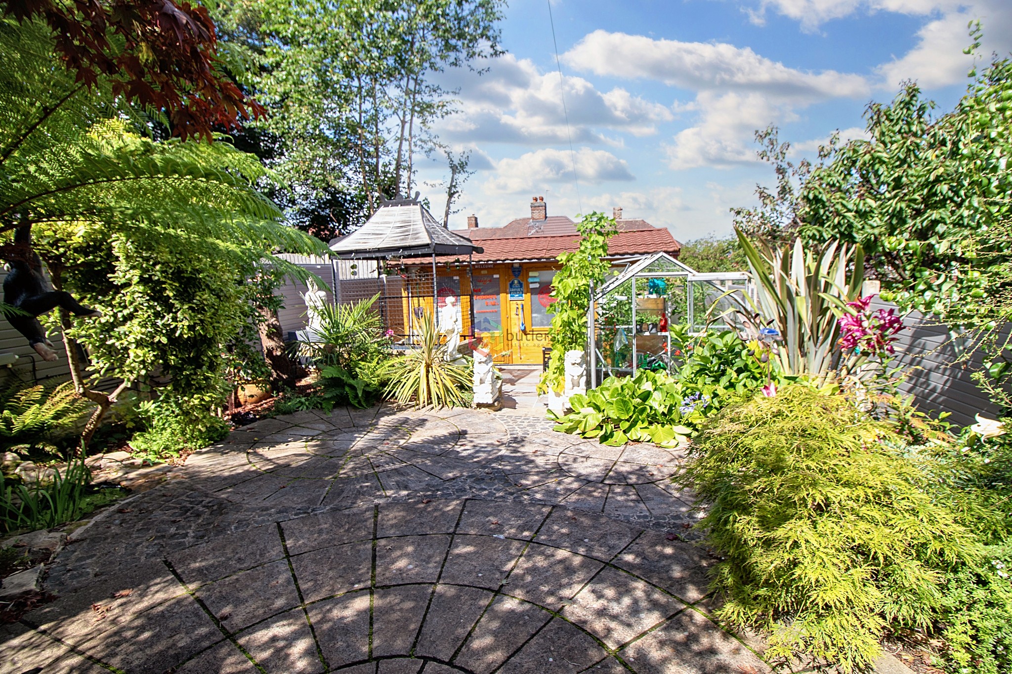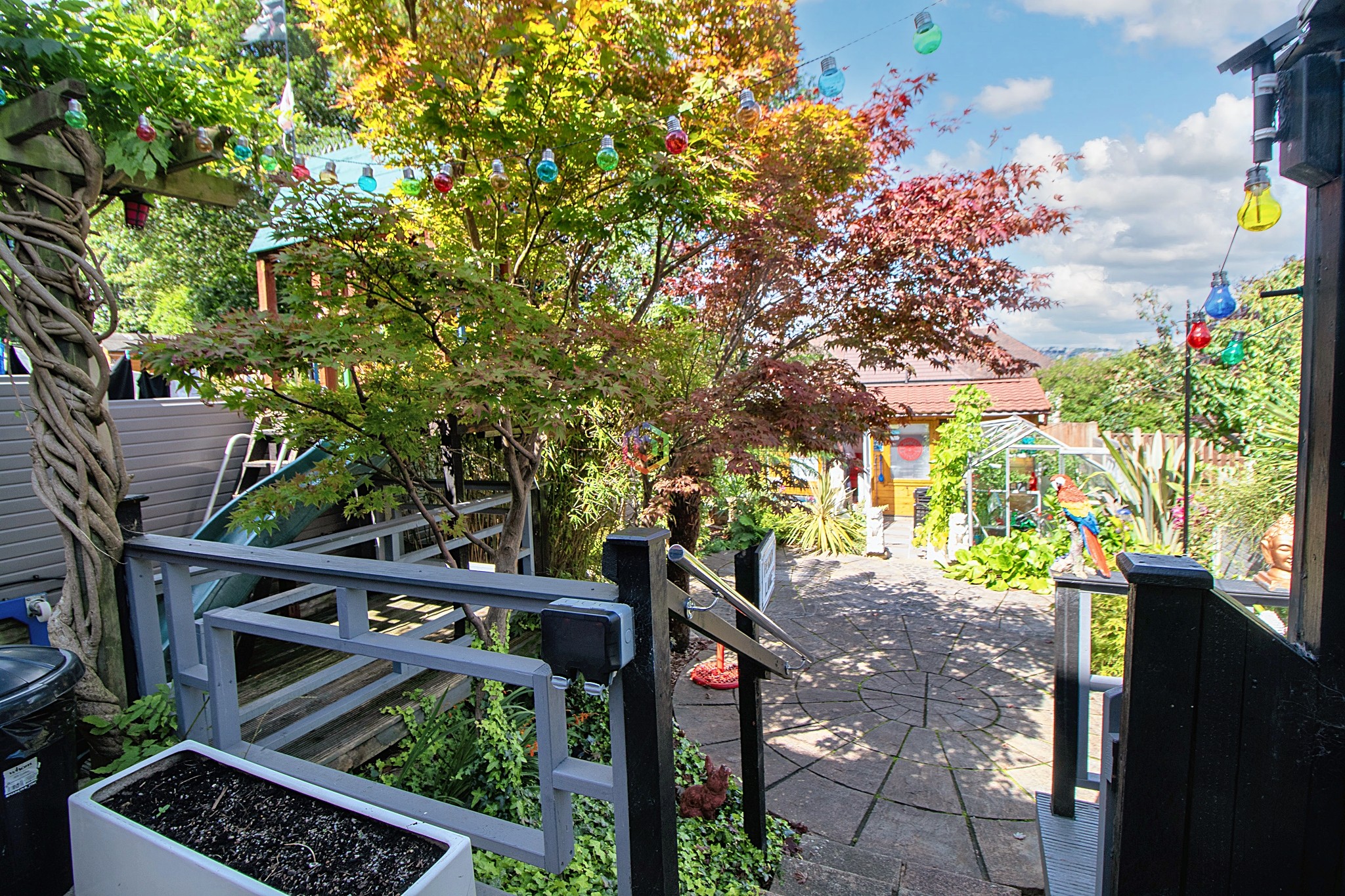 Step outside and discover a haven of outdoor living spaces. Ascend the steps to the first paved and decked area, where the current owners have installed a play centre, a metal shed, and a cosy seating nook on a raised deck. Descend further to find a hidden oasis enveloped by lush trees, shrubs, and plants, with the soothing sound of a running pond protected by a charming roof. For those with a green thumb, a greenhouse stands proudly near the bar, offering a space for gardening enthusiasts to nurture their plants. Gates open to reveal a single driveway flanked by steps leading to the front door, with an adjacent paved area doubling as yet another inviting patio setting for alfresco gatherings.