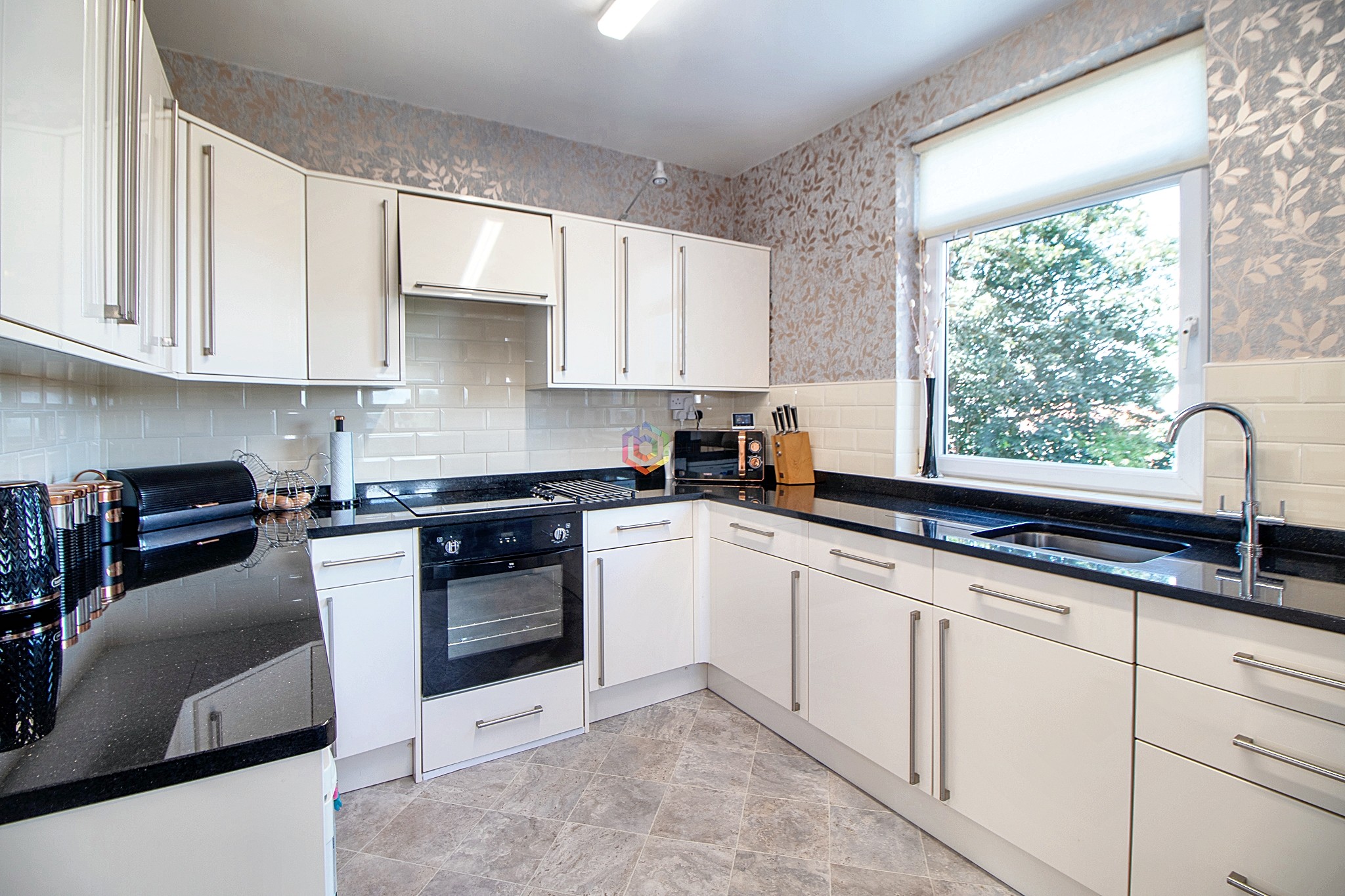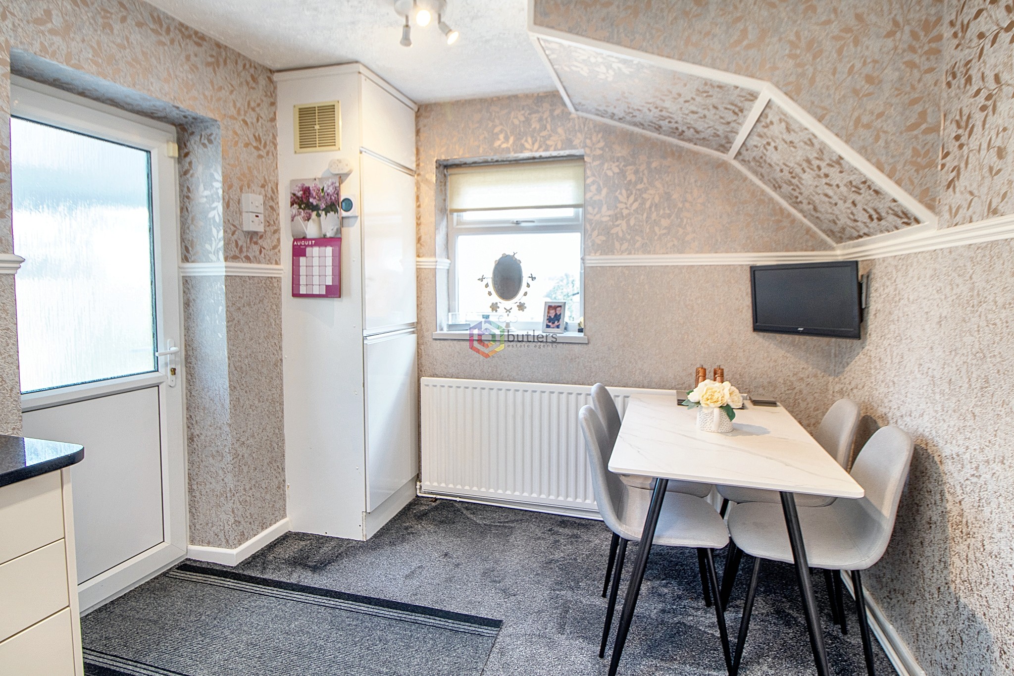 Across the rear of the house is the kitchen/diner which has a range of wall and floor-mounted units in a cream gloss with contrasting Black granite work surfaces with an inset sink. There is a black single electric oven, four burner gas hob and extractor above. The opposite end of the room has space for a table and chairs beneath the window to the side. There is a unit in the corner housing the boiler. What a great space for families and entertaining guests whilst the chef prepares the meals.