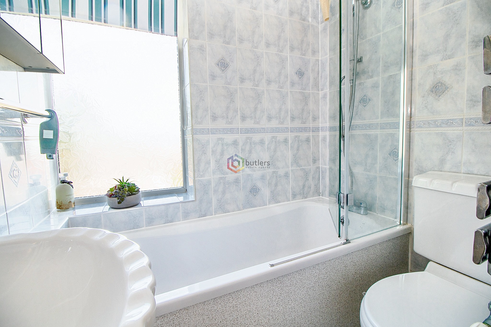 Fitted with a white bath with shower over, white Wc and white wash hand basin on a pedestal. There is a window to the rear. Forget about the day and retreat for a long soak.