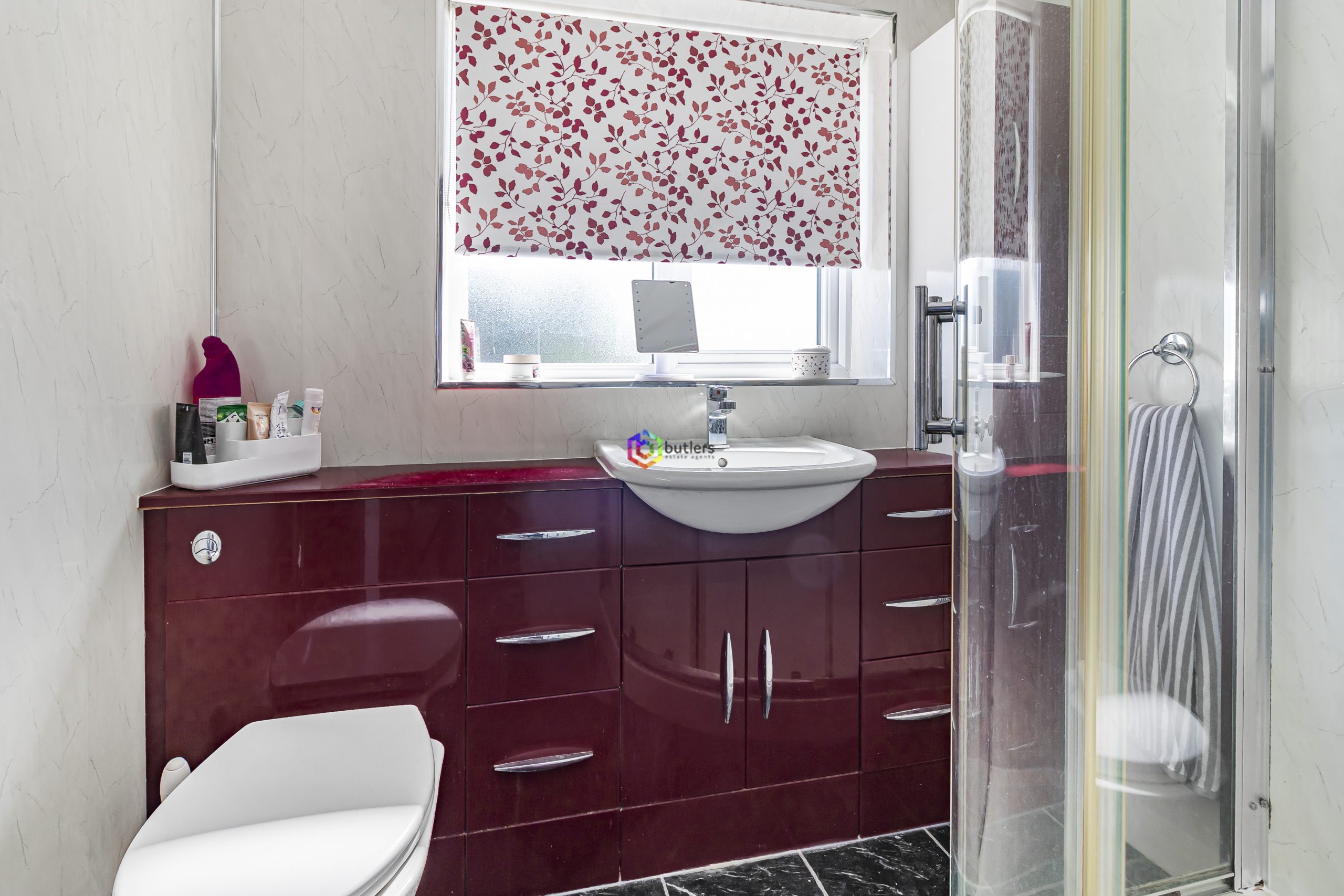 The bathroom currently comprises of a shower cubicle then a white wash hand basin and WC set into a deep red vanity unit.