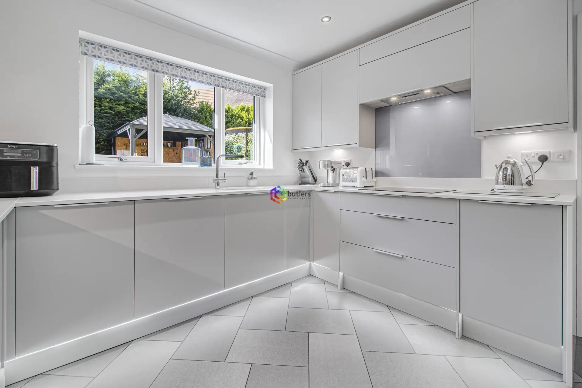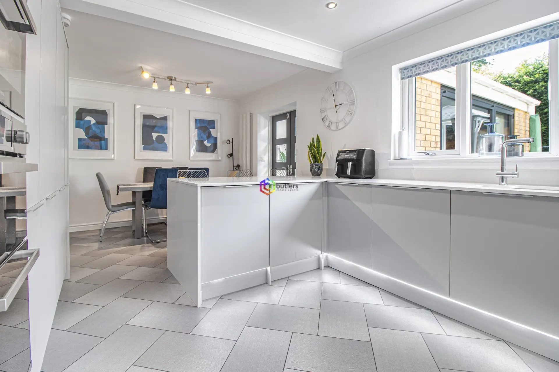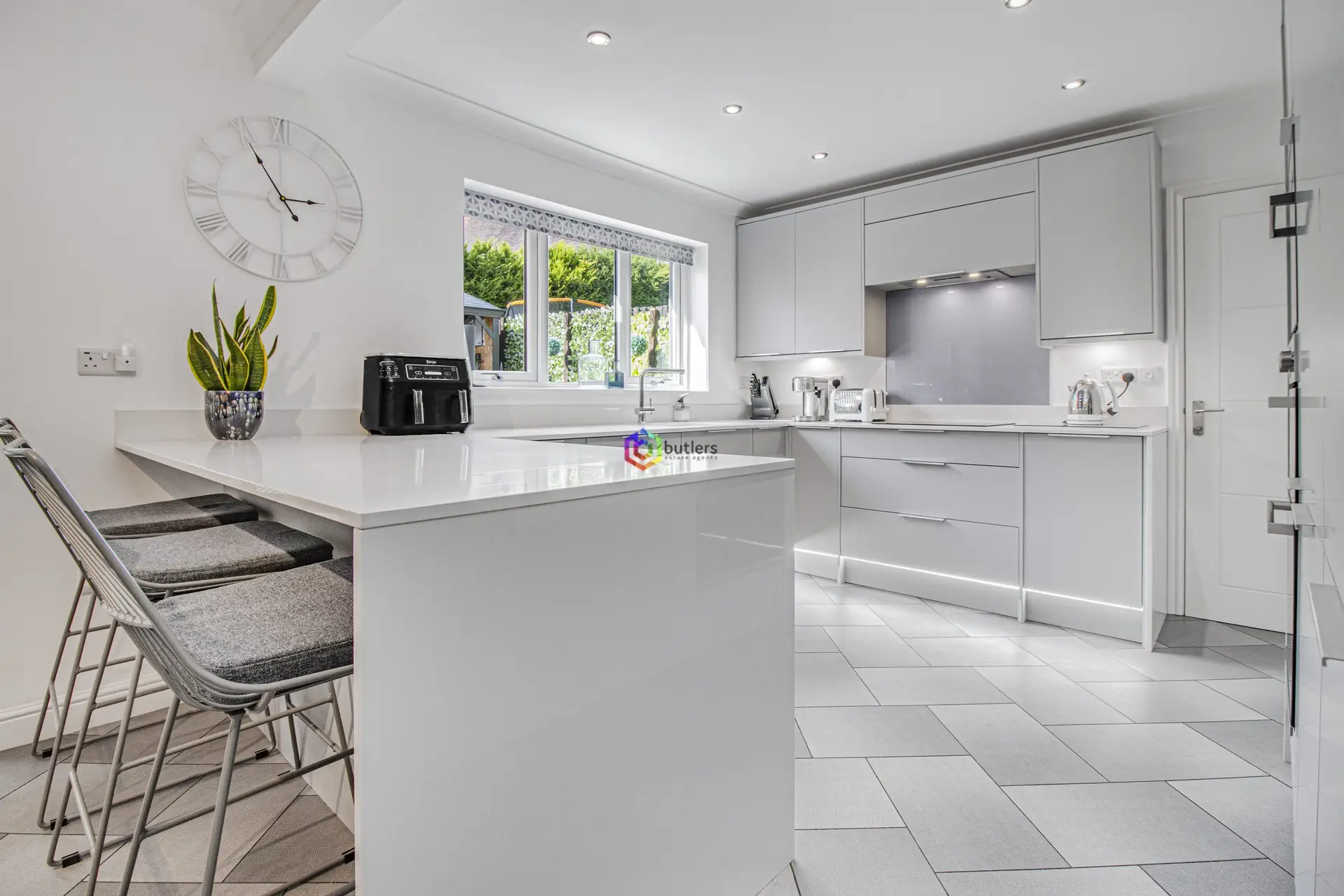 What an amazing space for entertaining and family time. With both a breakfast bar and space for a dining table and chairs it provides both formal and informal dining. The kitchen updated in recent years is in a modern grey colour with integrated appliances including an eye level oven, microwave combination oven, fridge freezer, dishwasher all lit with under counter lighting and complimented by modern Quartz work surfaces. There is a window over looking the rear garden, doors to the rear hall and to the Garden room.