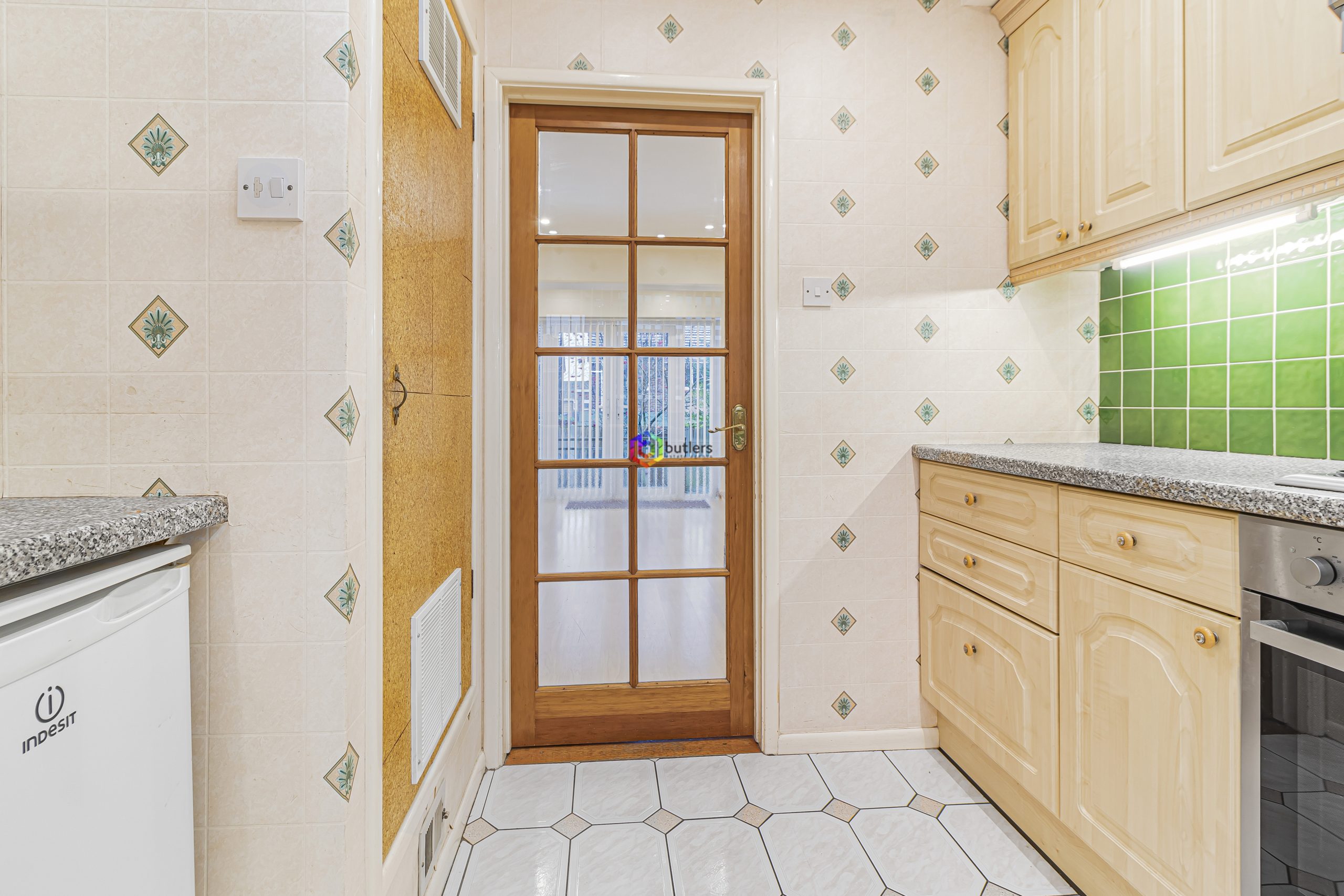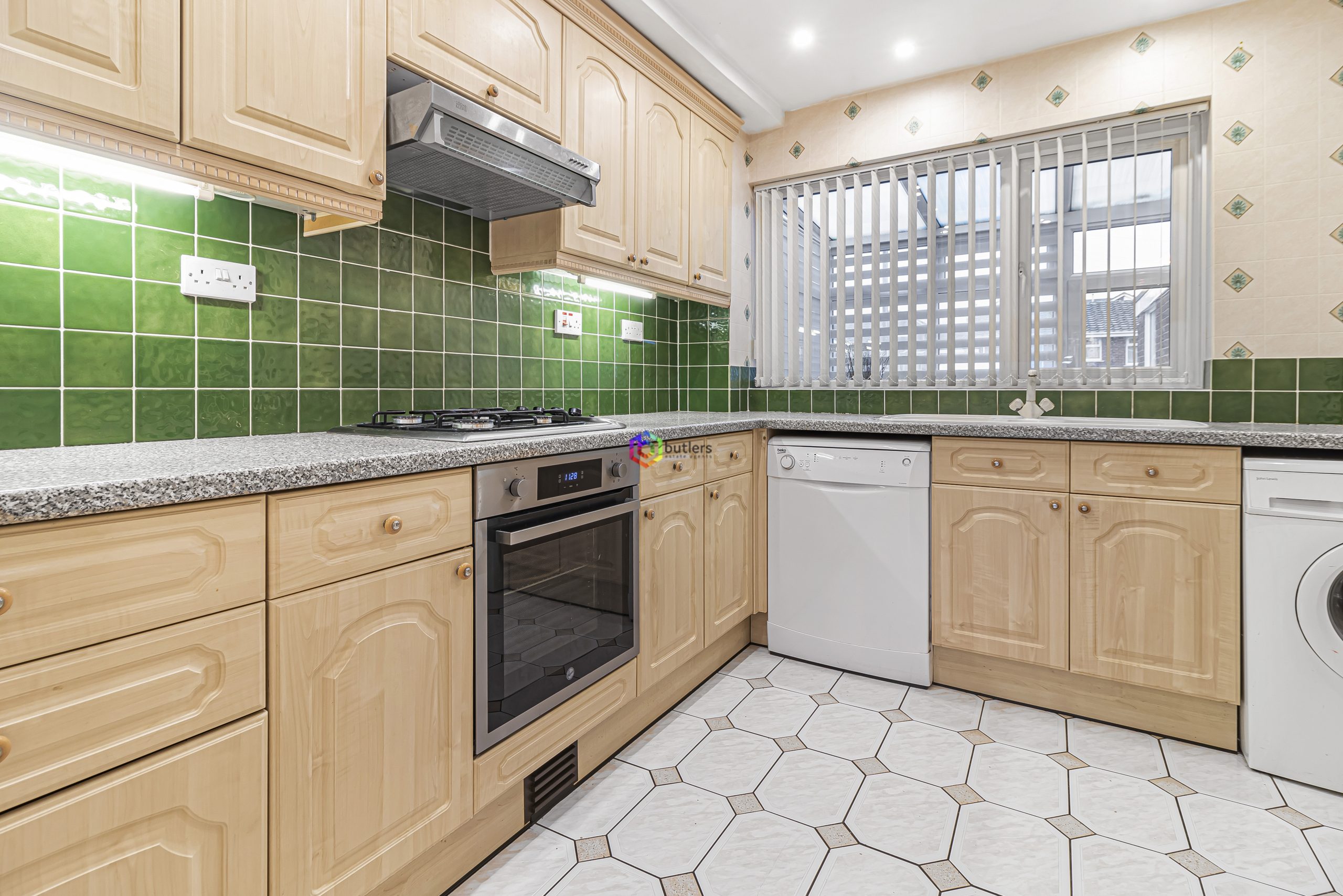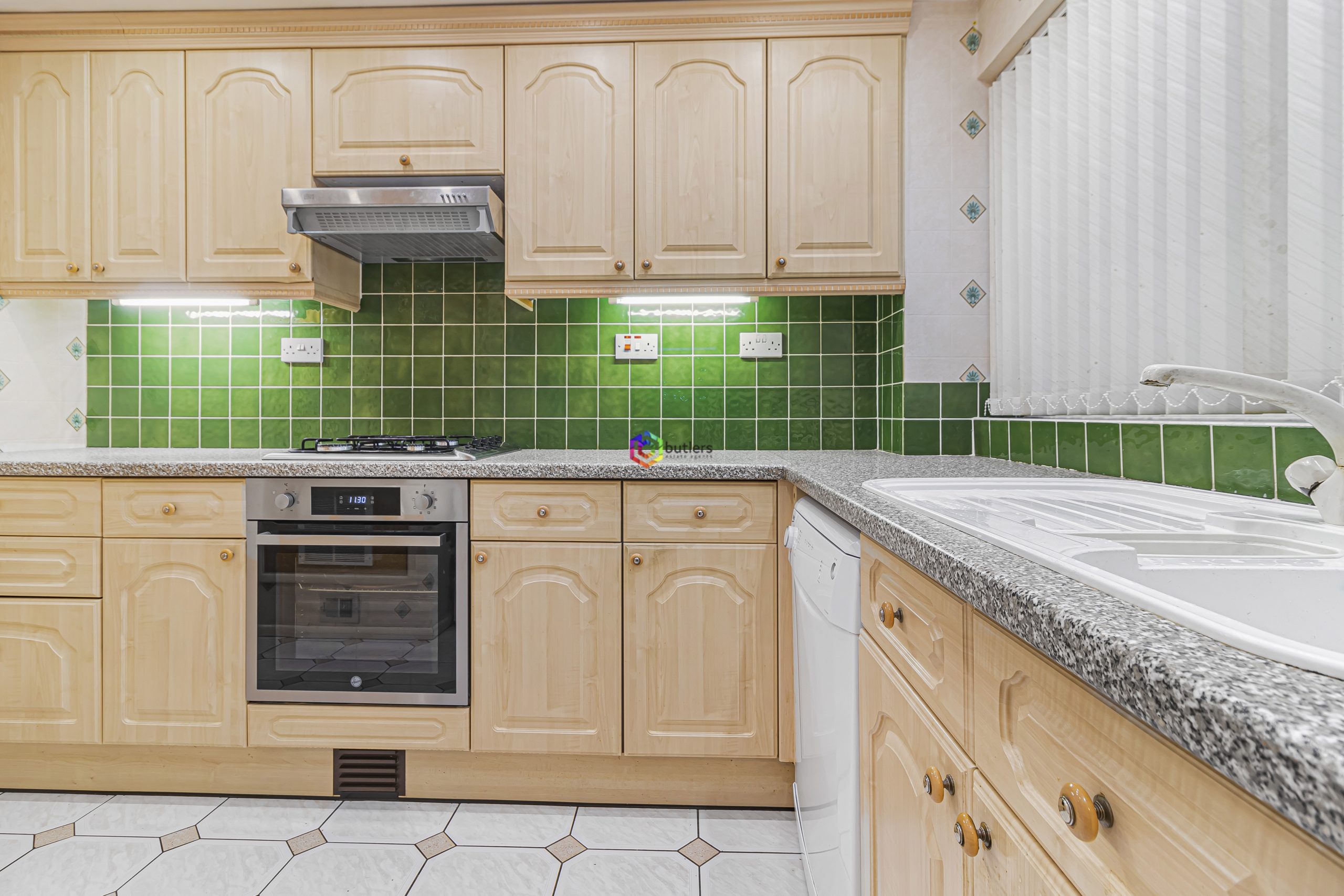 The kitchen is fitted with a range of wall and floor-mounted light wood units with contrasting work surfaces. There is a single electric oven with a four-burner gas hob above and an extractor. The sink is located beneath the window that looks into the conservatory to the front. There is also a cupboard which houses the Warm Air boiler for the central heating.