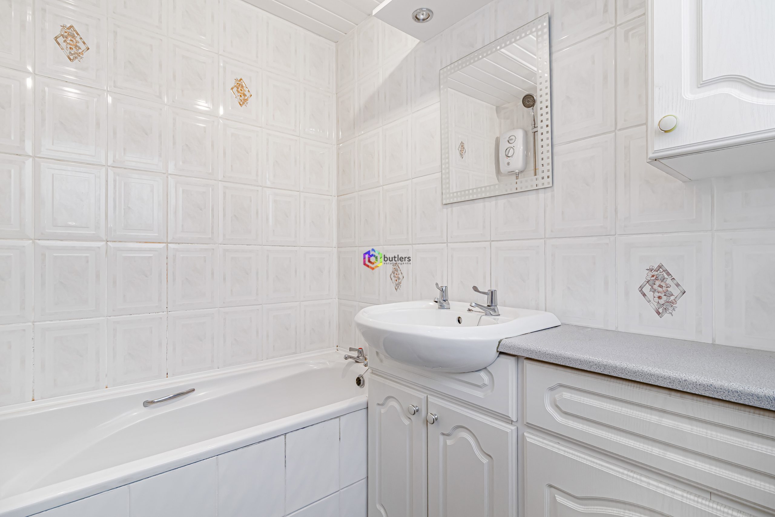 A fully tiled bathroom with a white bath with shower over, a white wash hand basin inset to the vanity unit and a white WC. There is a window to the front.