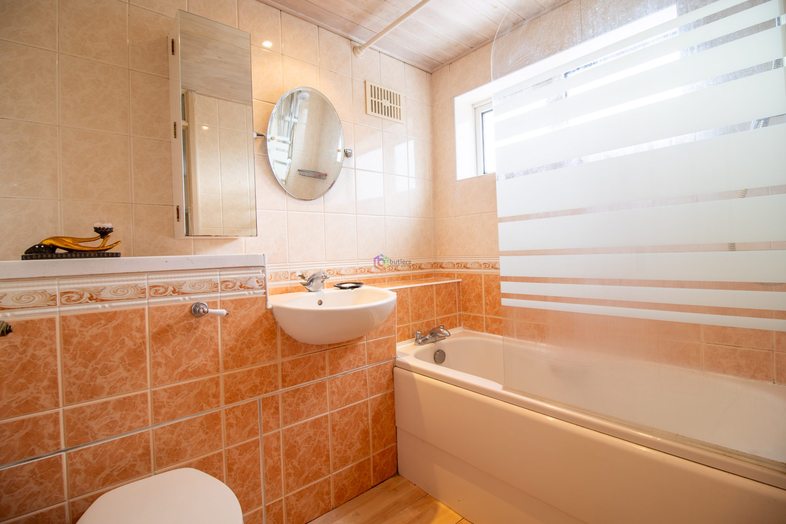 Fitted with a white bath with shower over, white wall mounted wash hand basin and white WC.