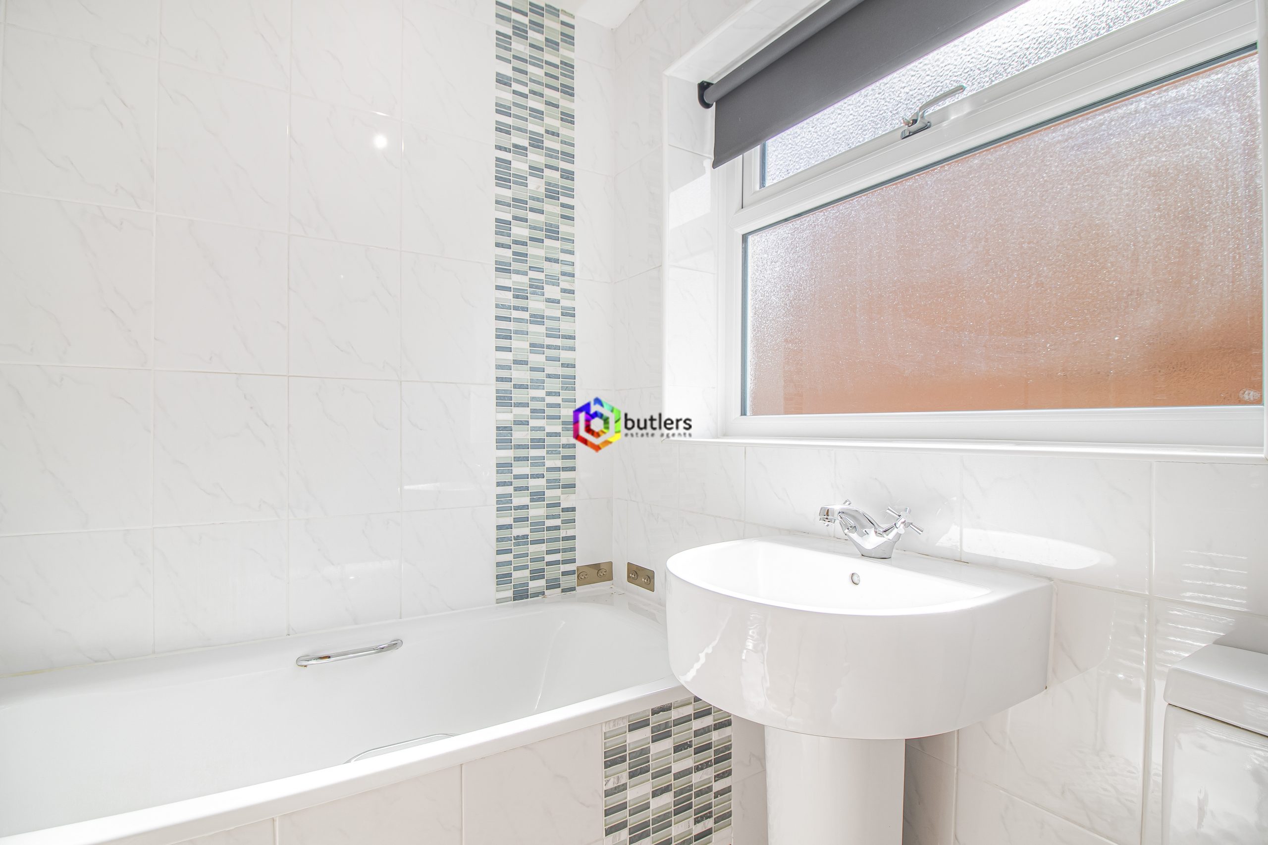 The modernised bathroom offers a white bath with shower over, white wash hand basin on pedestal and a white WC. There is a window to the side.